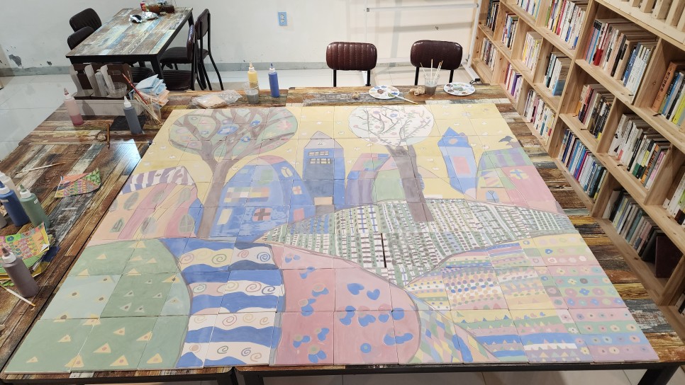 이번 활동은 우천의 경우를 다행히 대비를 하여 오프라인으로 진행하기로 했던 벽화봉사활동은 취소되고 타일벽화활동으로 대체하여 진행하고 있었습니다. 사이즈는 많이 작아지지만 타일벽화도 결코 나쁘지 않은 활동이기에 좋은 결과물을 위해 또 노력해야겠죠. 궂이 음식에 비교한다면 벽면에 직접 그리는 벽화는 빨리 완성되고 넓은 면을 진행할 수 있지만 타일벽화는 적은면에 오랜 시간을 투자해 진행하는 슬로우 푸드같다고 해야할까요. 타일벽화는 그리는 과정-전체를 모아두고 보정하는 과정-굽기전에 유약을 바르는 과정-재벌과정 그리고 마지막 시공과정까지 한달정도가 소요됩니다.